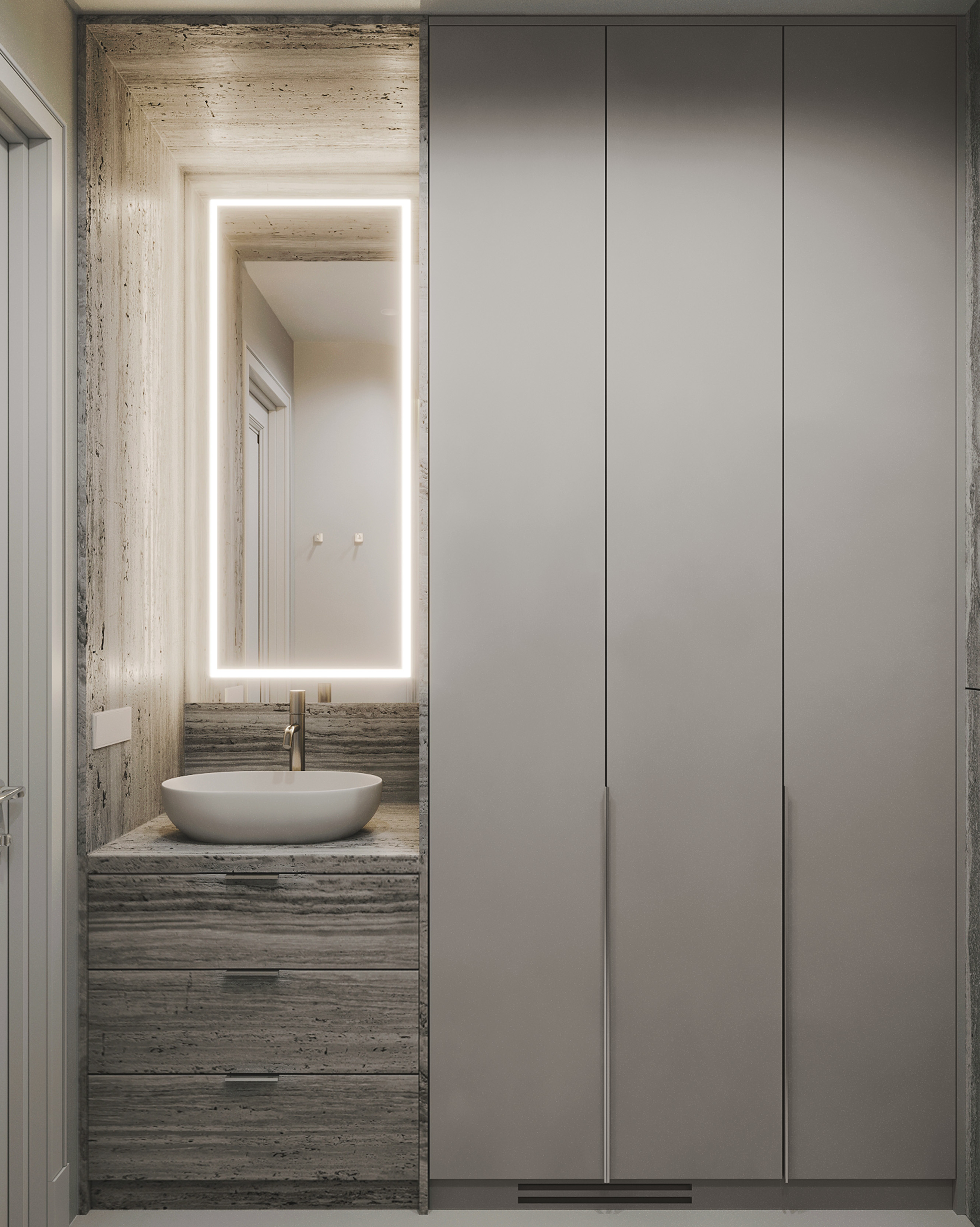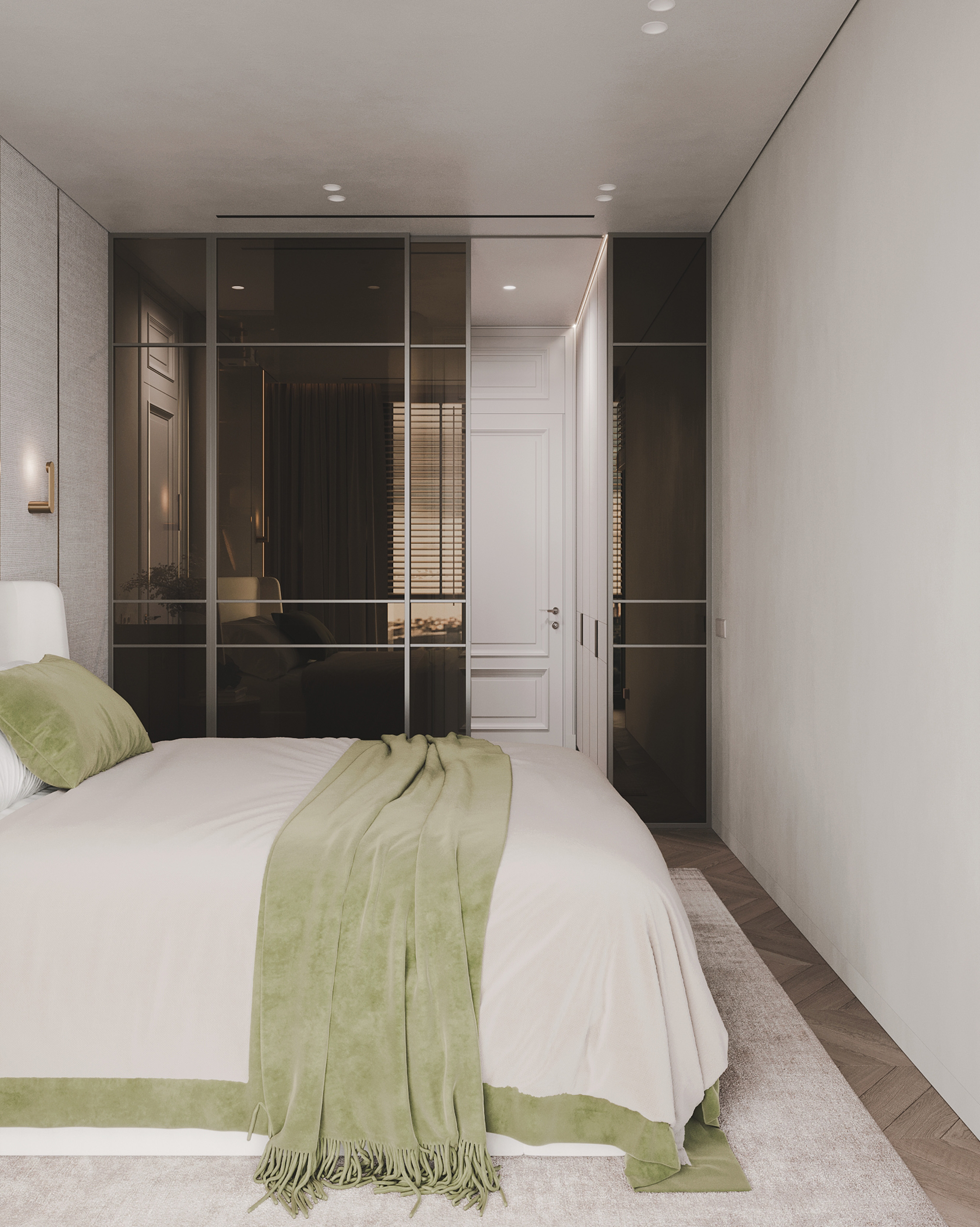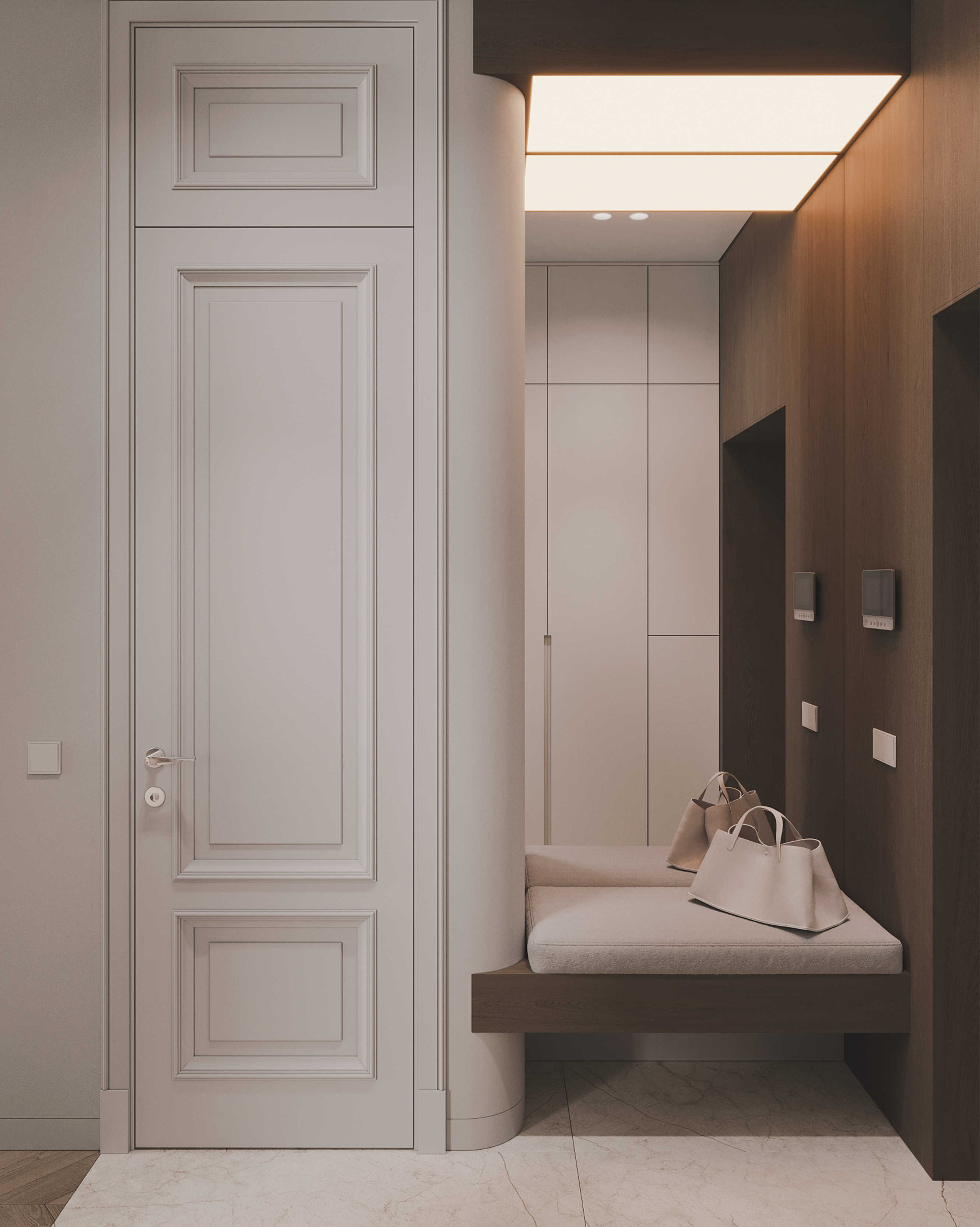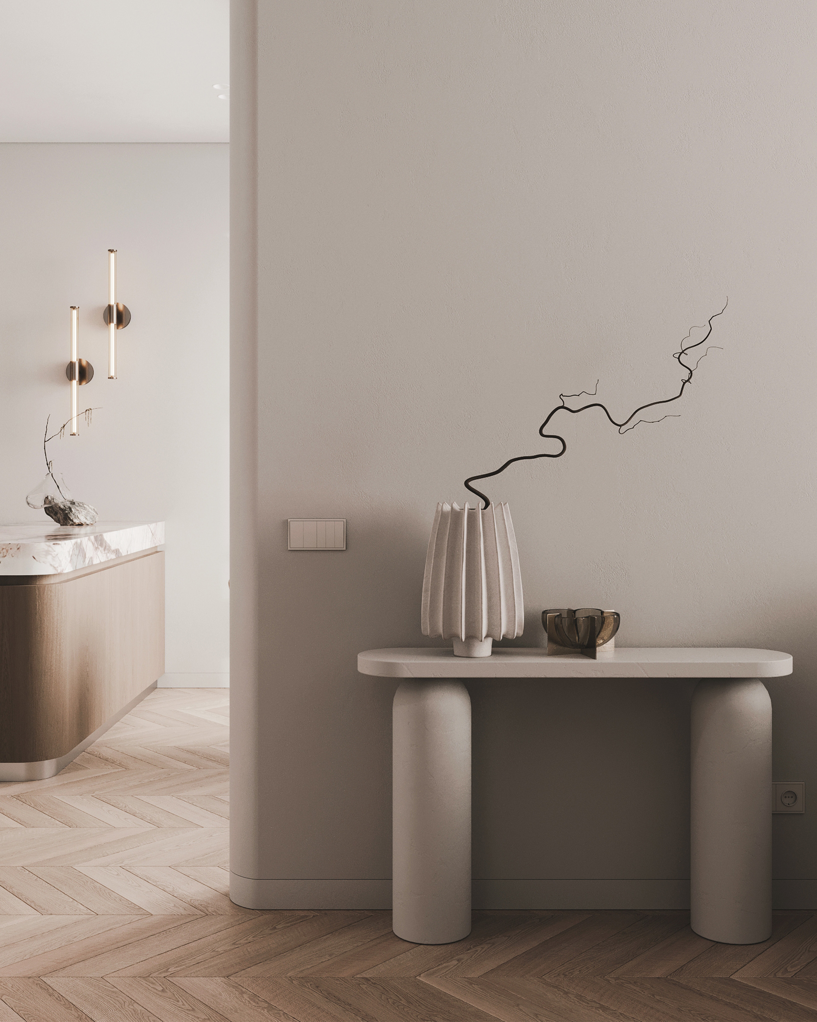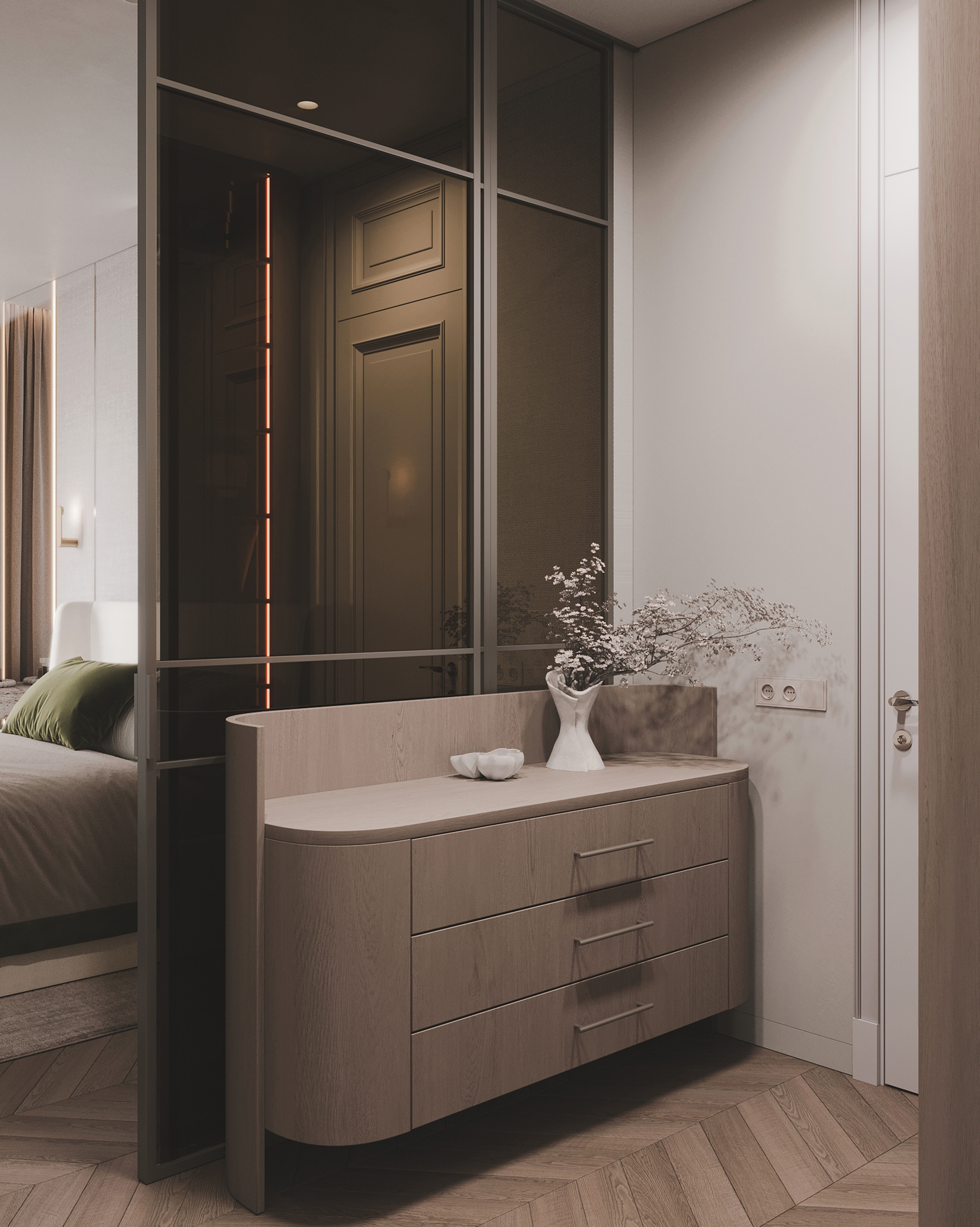 Интерьер квартиры для молодой пары выполнен в эстетике современной «тихой роскоши», где статус считывается через качество материалов, продуманную архитектуру и тактильные ощущения.