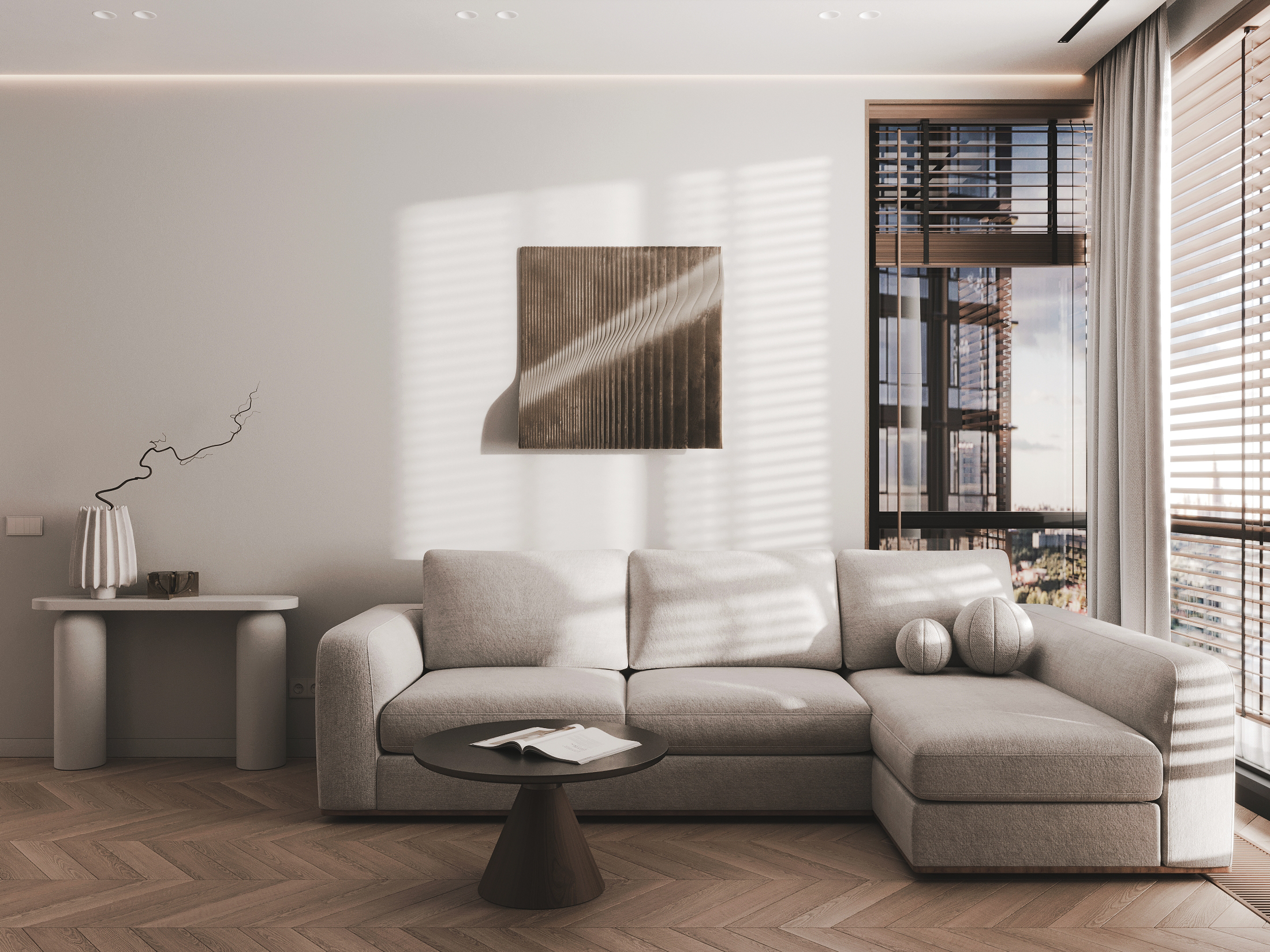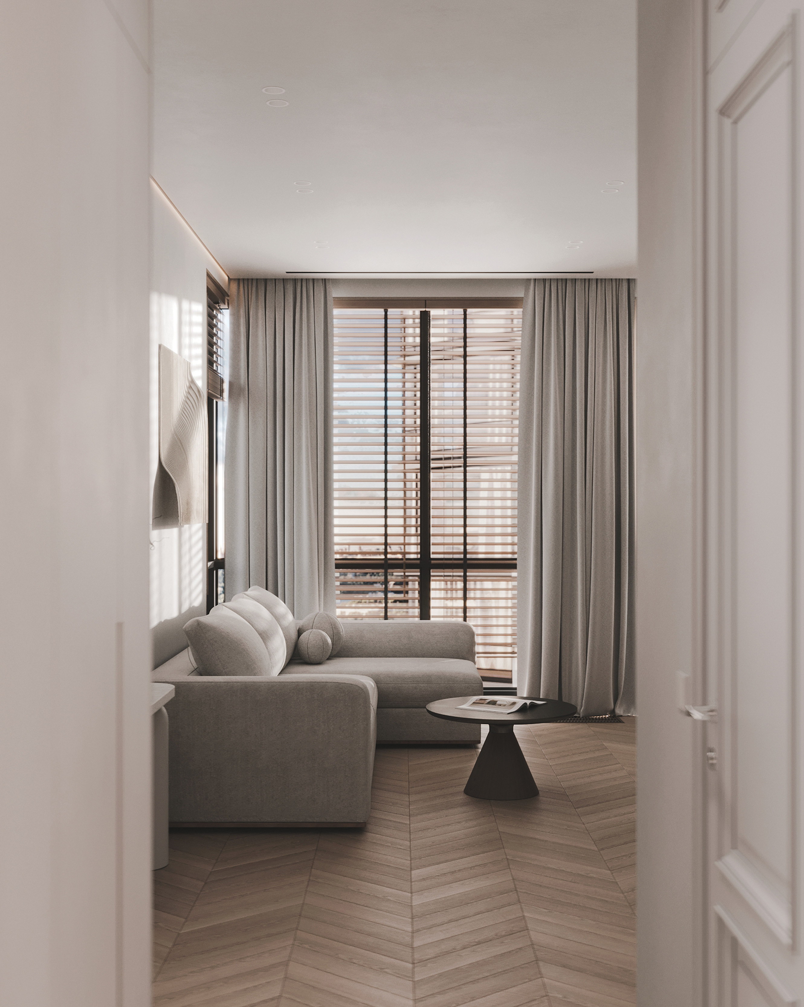 Пространство выстроено вокруг панорамного вида на набережную: натуральные оттенки, мягкий свет и минималистичная композиция подчеркивают связь с окружающим пейзажем.