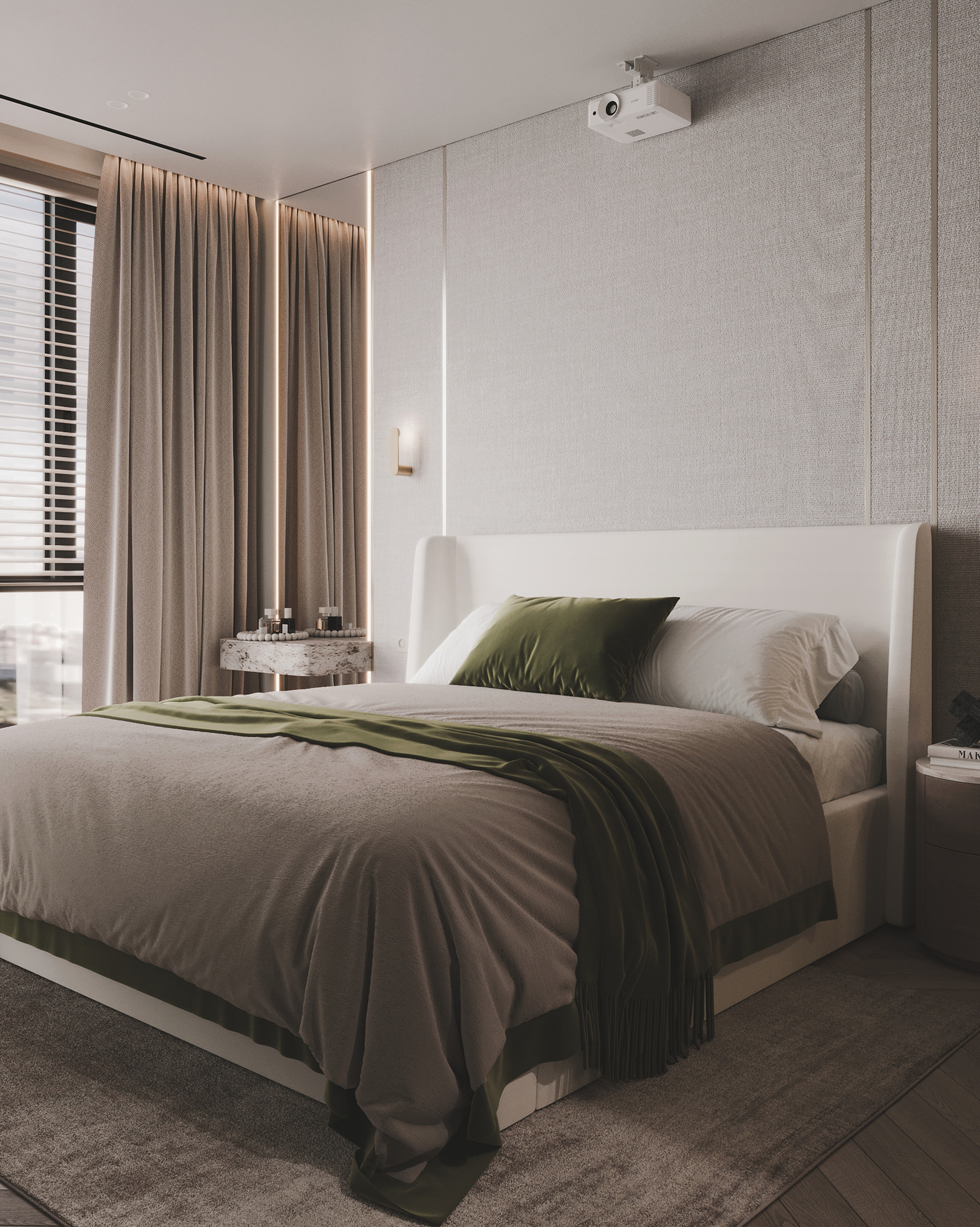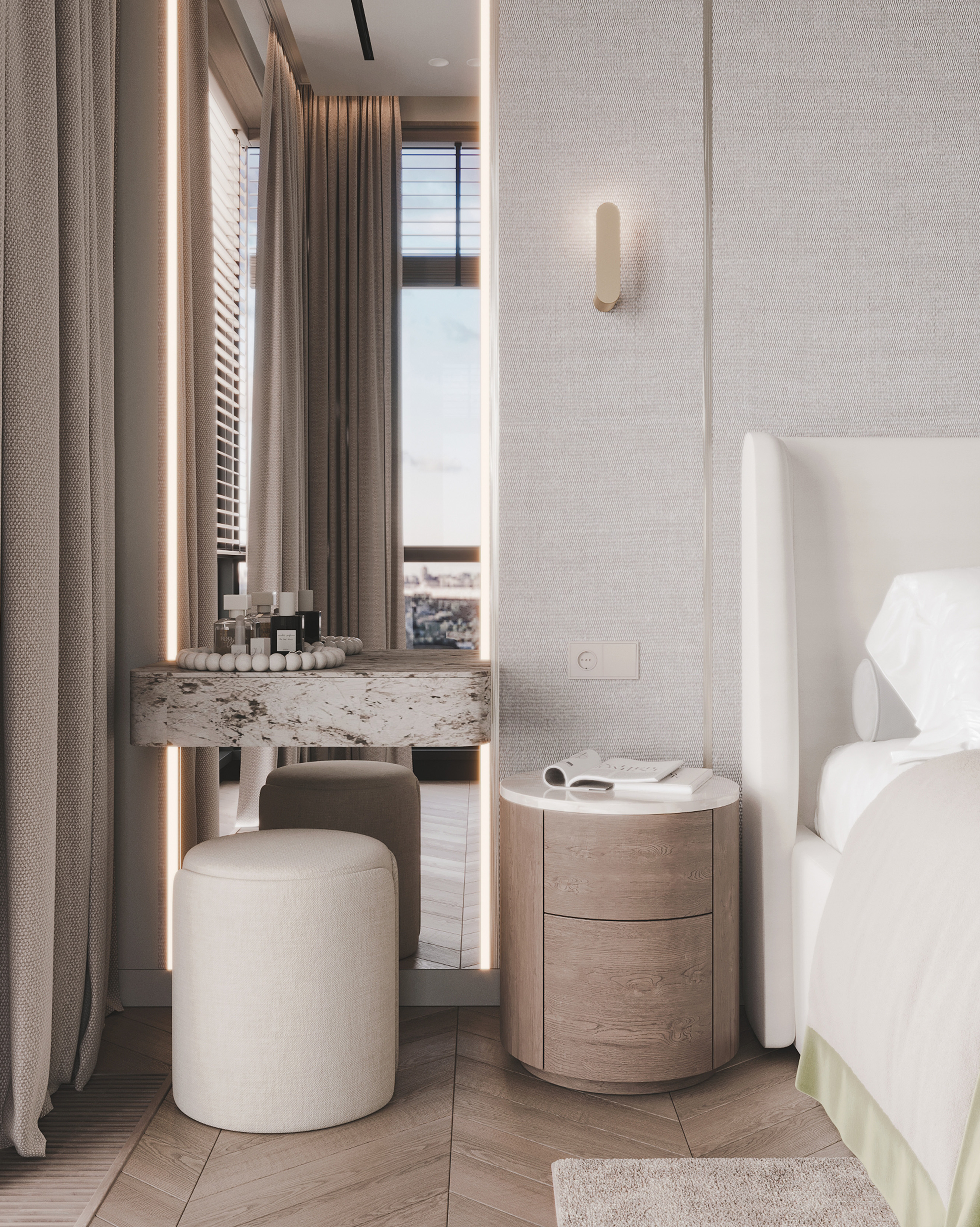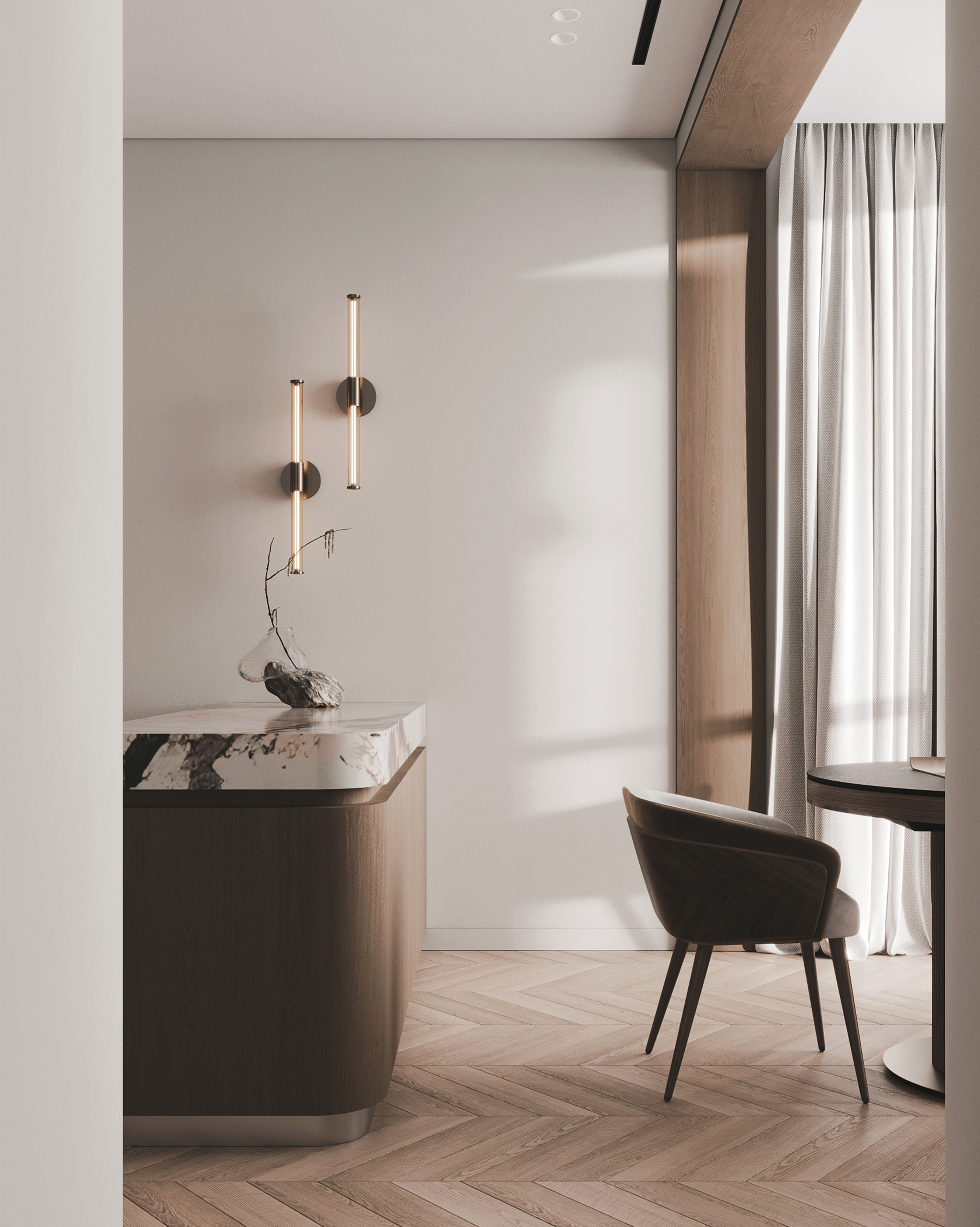 Приватные зоны решены как спокойные, обволакивающие пространства с акцентом на комфорт и текстуры. Использование дерева, камня и мягких тканей создаёт глубину и ощущение уюта без визуальной перегрузки.