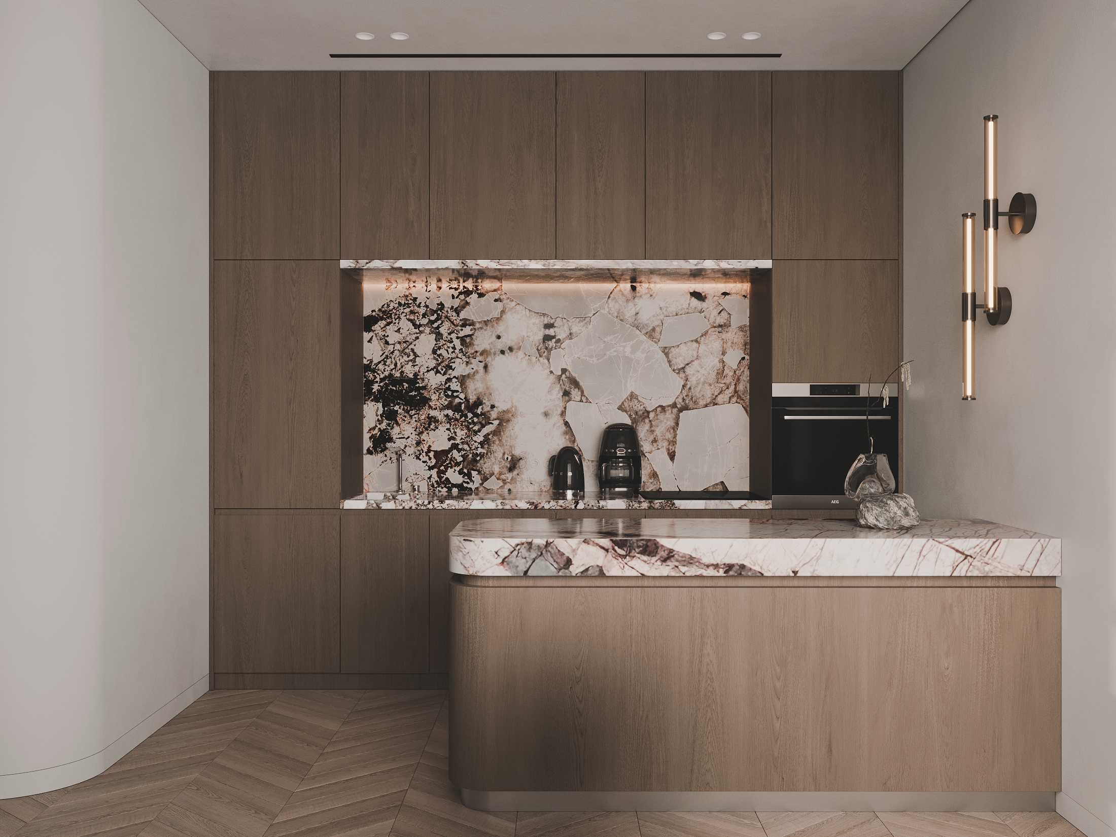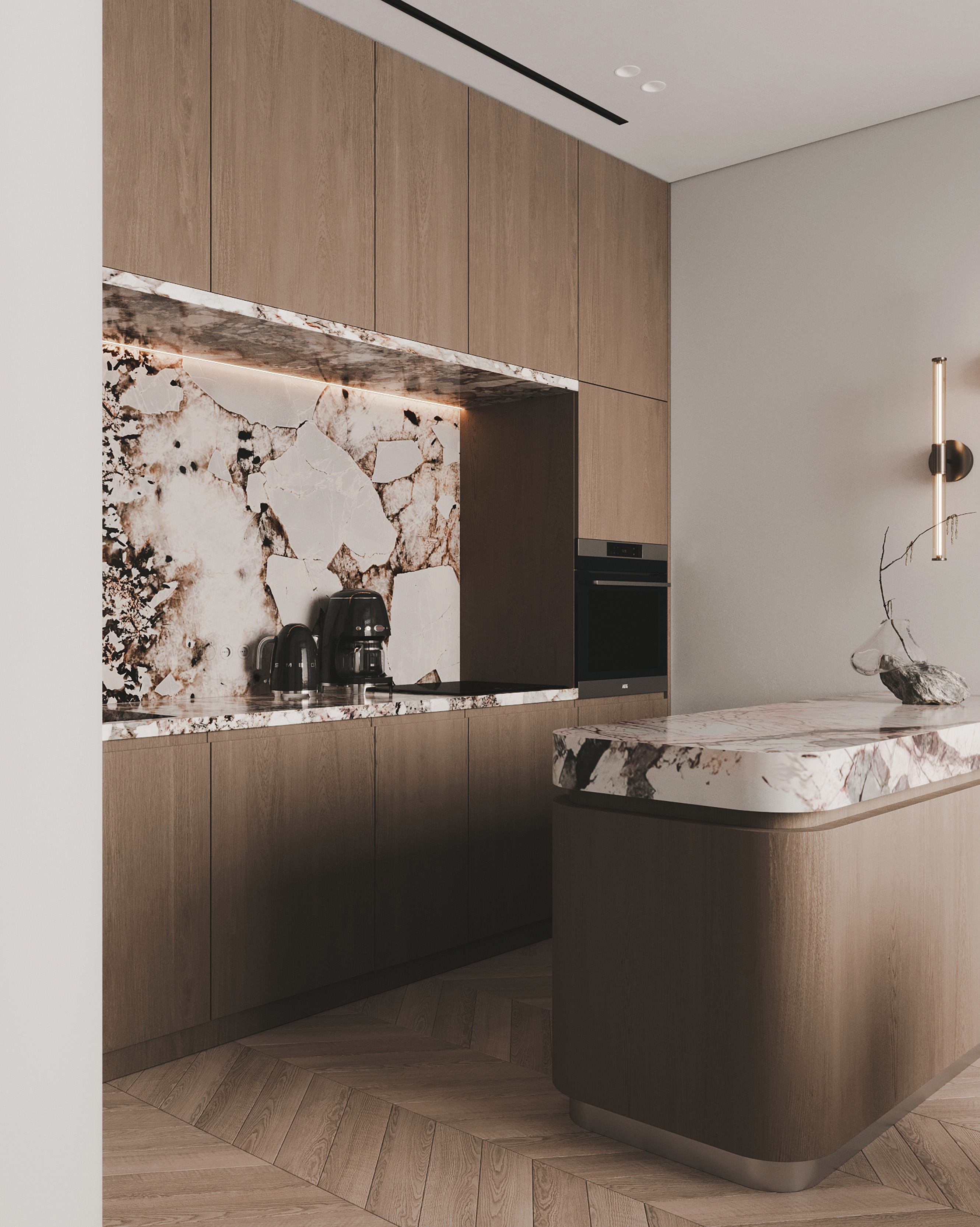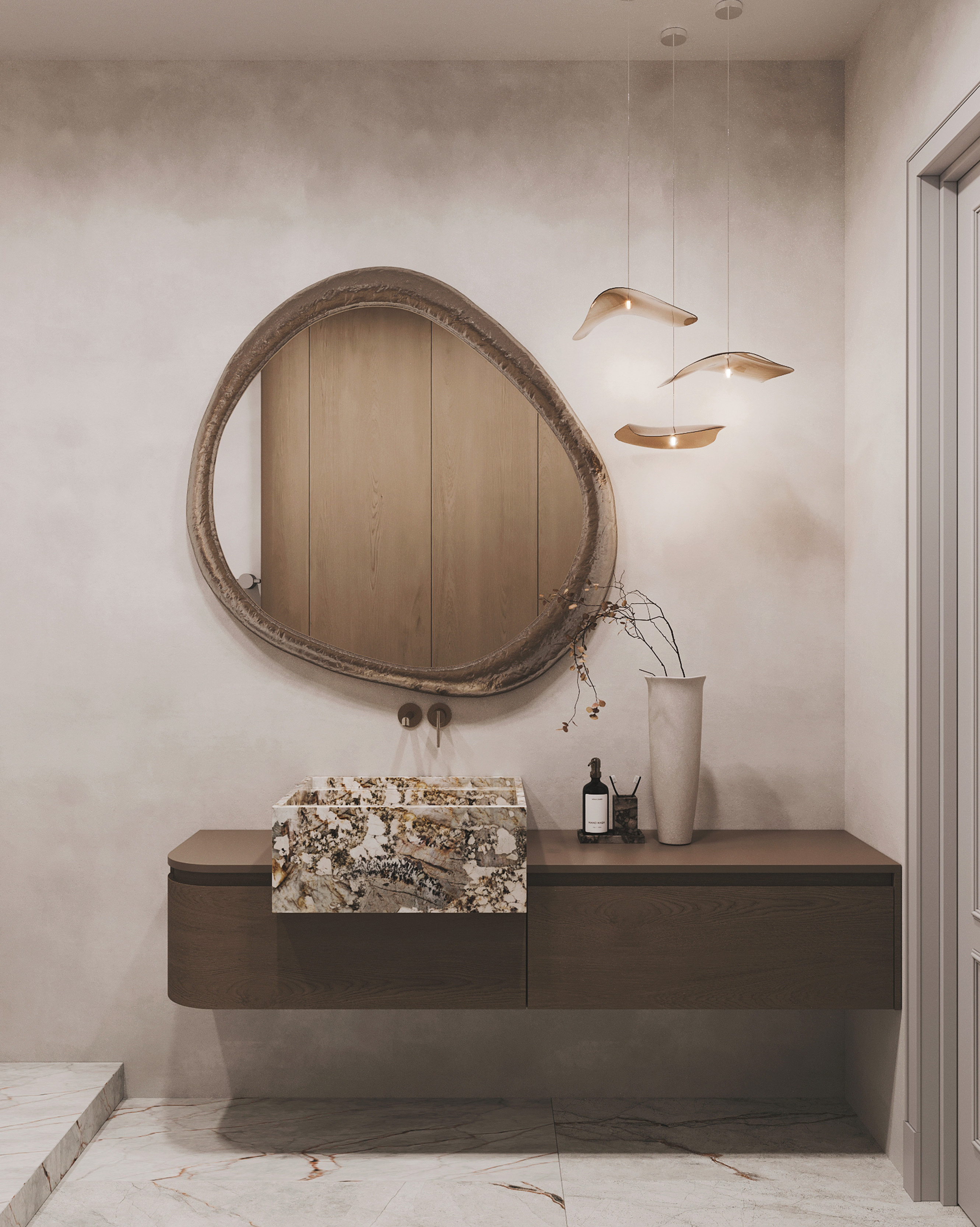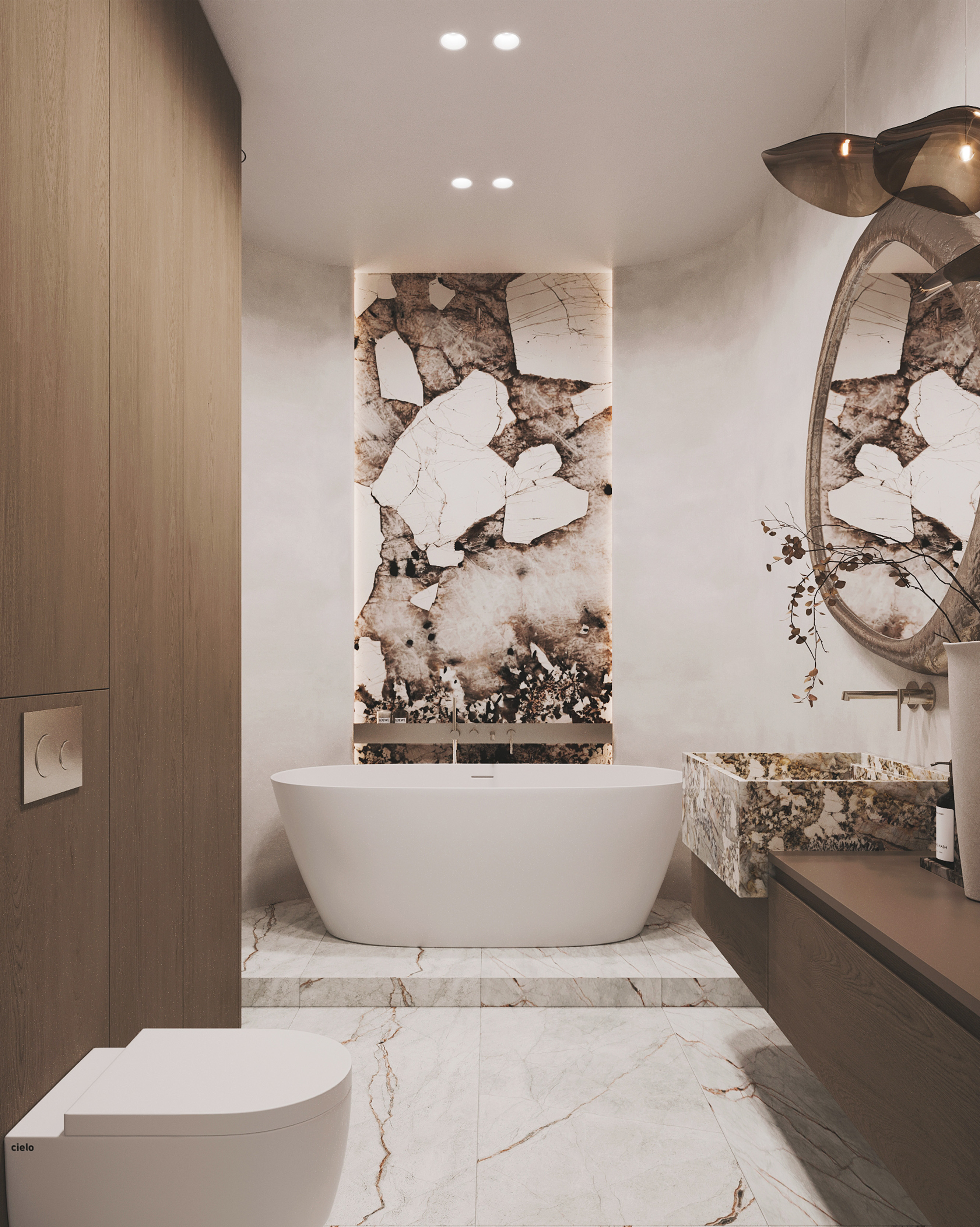 Приватные зоны решены как спокойные, обволакивающие пространства с акцентом на комфорт и текстуры. Использование дерева, камня и мягких тканей создаёт глубину и ощущение уюта без визуальной перегрузки.